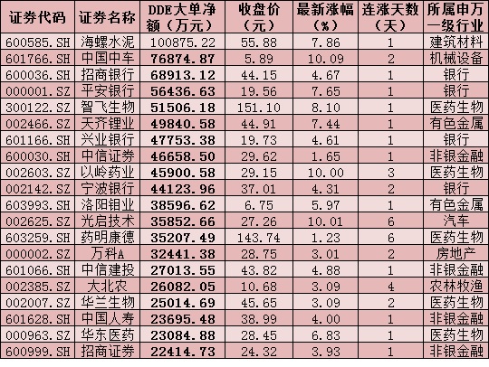 一、周三(1月6日)DDE大單資金凈買入TOP20