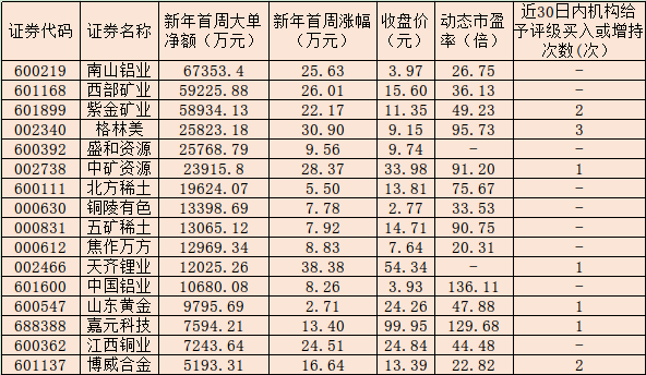 表:新年首周獲超5000萬元大單資金搶籌的有色金屬股