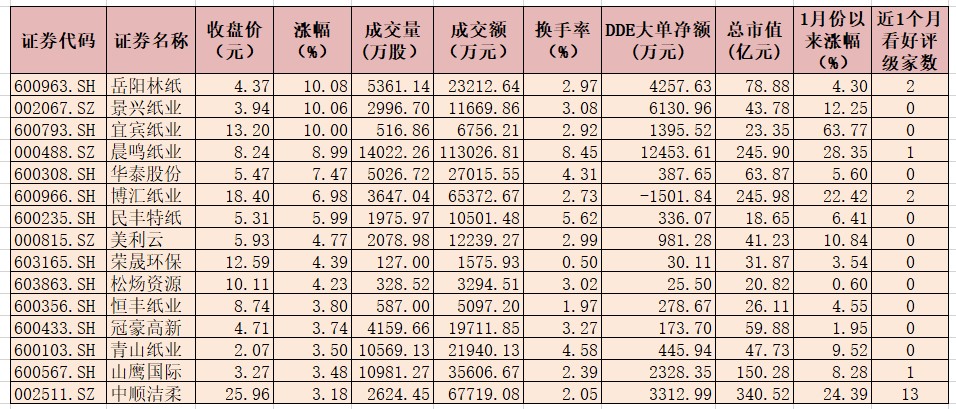 表:1月12日造紙行業(yè)漲幅超3%個(gè)股一覽