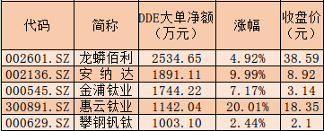 表:本周二獲超1000萬元大單資金布局的鈦白粉概念股