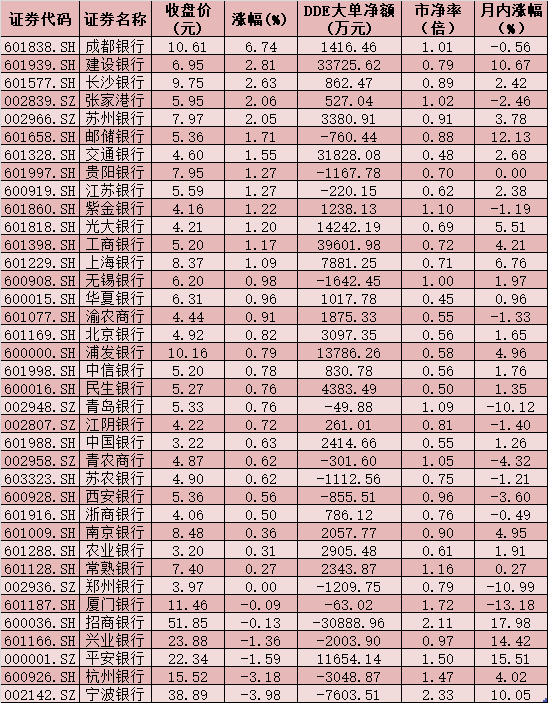 可以看到,今年以來,共有24只銀行股實(shí)現(xiàn)上漲,占行業(yè)成份股家數(shù)比例超過六成,其中,招商銀行、平安銀行、興業(yè)銀行、郵儲銀行、建設(shè)銀行、寧波銀行等6只個股期間累計漲幅均在10%以上。
