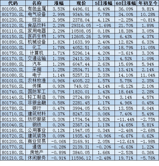 從行業(yè)來看,周四,申萬一級28個行業(yè)中,有24個行業(yè)指數(shù)飄紅。其中,有色金屬行業(yè)表現(xiàn)強勢,漲幅居首,達(dá)3.53%;緊隨其后的是電氣設(shè)備、綜合、食品飲料、家用電器等四行業(yè),漲幅均超2%,分別為2.99%、2.95%、2.29%和2.29%;僅有休閑服務(wù)、房地產(chǎn)、通信和商業(yè)貿(mào)易等四行業(yè)小幅回落。