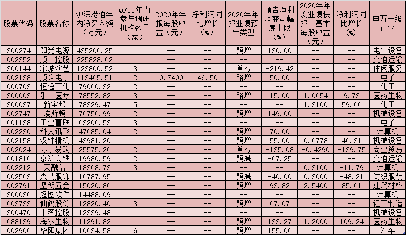 年報業(yè)績預(yù)期向好或是近期QFII頻繁調(diào)研的重要支撐。在上述年內(nèi)被QFII調(diào)研的101家公司中,截至3月3日,沃爾核材、順絡(luò)電子、愛美客、和而泰等4家公司已披露2020年年報業(yè)績,這些公司報告期內(nèi)全部實現(xiàn)凈利潤同比增長,分別達(dá)到88.82%、46.50%、43.93%和30.54%。同時,有42家公司也披露了2020年年度業(yè)績快報,報告期內(nèi)實現(xiàn)凈利潤同比增長的公司有32家,恒玄科技、華潤微、海爾生物等3家公司報告期內(nèi)均實現(xiàn)凈利潤同比翻番。