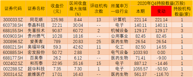 具體來看,新進(jìn)增持方面,截至2020年四季度末,QFII新進(jìn)同花順、泰晶科技、先惠技術(shù)、貴州燃?xì)狻勖揽偷?只個(gè)股,并對(duì)奧福環(huán)保進(jìn)行繼續(xù)加倉(cāng)操作,QFII增持?jǐn)?shù)量為14.55萬股,最新持股數(shù)量為82.50萬股。此外,還持有宏發(fā)股份1033.93萬股未動(dòng),對(duì)百奧泰、和而泰、超華科技和戴維醫(yī)療則有所減倉(cāng)。