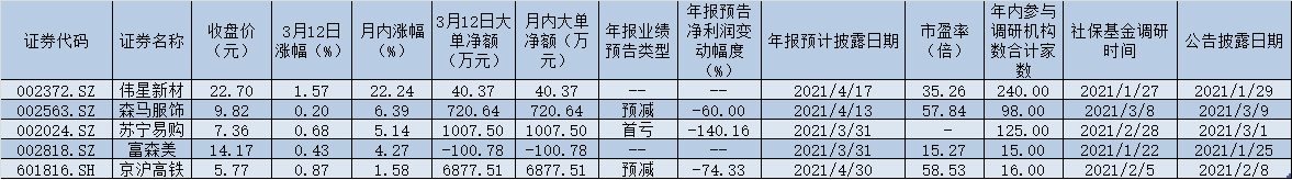 3月份以來,截至3月12日,上證指數(shù)期間累計(jì)跌幅達(dá)到1.60%,深證成指期間累計(jì)跌幅為4.21%。上述5家被社?;鹫{(diào)研公司股價(jià)均出現(xiàn)逆市上漲,其中,偉星新材以期間累計(jì)漲幅22.24%位居首位,森馬服飾、蘇寧易購、富森美、京滬高鐵等4只個(gè)股期間累計(jì)漲幅則分別為6.39%、5.14%、4.27%、1.58%。