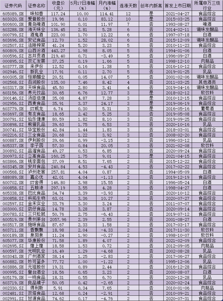 表:股價實現(xiàn)連漲的食品飲料股一覽