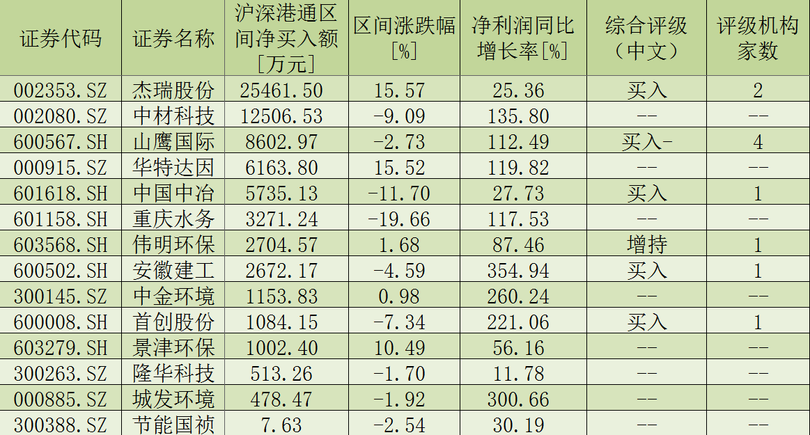 表:污水處理板塊二季度以來獲北向資金加倉股一覽