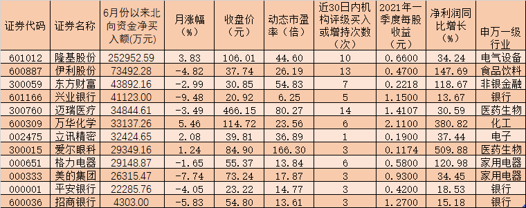 可以看到,近期外資持續(xù)流入A股,富時中國A50指數(shù)成份股成為外資搶籌的重點目標。統(tǒng)計顯示,上述50只成份股中,6月份以來截至6月15日,有28只個股現(xiàn)身滬股通、深股通的前十大成交活躍股榜單,有12只成份股月內處于北向資金凈買入狀態(tài),合計吸金62.33億元。其中,隆基股份期間累計北向資金凈買入額居首,達到25.30億元,伊利股份、東方財富、興業(yè)銀行、邁瑞醫(yī)療、萬華化學、立訊精密等6只個股期間也均受到3億元以上北向資金青睞,后市表現(xiàn)值得關注。