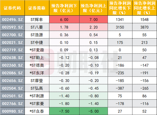 截至今日,ST股板塊已有33家企業(yè)發(fā)布中報(bào)預(yù)告,剔除其中僅作文字預(yù)告“預(yù)測(cè)不確定”、“凈利潤(rùn)可能為虧損”的個(gè)股,已有5只獲風(fēng)險(xiǎn)示警個(gè)股確定上半年業(yè)績(jī)?yōu)檎?,其中化工股ST輝豐(3.170,0.05,1.60%)(維權(quán))成績(jī)最為亮眼,預(yù)告凈利潤(rùn)約6-7億,增長(zhǎng)幅度高于1341%。此前屢遭炒作的*ST眾泰今年上半年則已確定虧損超5億元。