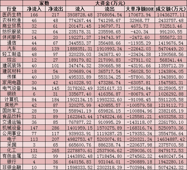 從資金層面看,周一,A股大單資金整體凈流出313.3億元,其中,有1416只個(gè)股呈現(xiàn)資金凈流入,有2886只個(gè)股呈現(xiàn)資金凈流出。從申萬(wàn)一級(jí)的28個(gè)行業(yè)來(lái)看,醫(yī)藥生物、農(nóng)林牧漁、商業(yè)貿(mào)易等3個(gè)行業(yè)呈現(xiàn)資金凈流入態(tài)勢(shì),分別為17.07億元、3.29億元和0.47億元。另外,25個(gè)行業(yè)均呈現(xiàn)資金凈流出態(tài)勢(shì),其中,非銀金融、銀行、有色金屬、化工、采掘、電子等行業(yè),資金凈流出均超20億元。