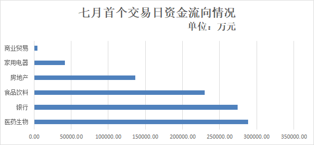 《證券日報》記者根據(jù)同花順統(tǒng)計發(fā)現(xiàn),7月1日,A股大單資金整體凈流出385.33億元,其中,有1453只個股呈現(xiàn)大單資金凈流入。從申萬一級的28個行業(yè)來看,醫(yī)藥生物、銀行、食品飲料、房地產(chǎn)、家用電器、商業(yè)貿(mào)易等6個行業(yè)呈現(xiàn)大單資金凈流入態(tài)勢,分別為28.86億元、27.43億元、22.99億元、13.65億元、4.17億元、4586.43萬元,合計吸金97.56億元。