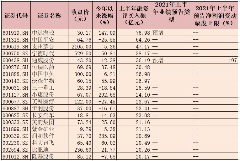 個(gè)股方面,今年上半年,共有1058只股票獲融資客加倉,其中,有440只個(gè)股期間融資凈買入額均超過1億元,中遠(yuǎn)??亍⒅袊桨?、貴州茅臺(tái)期間融資凈買入額居前三,分別為76.98億元、64.26億元、47.17億元,寧德時(shí)代、通威股份、恒瑞醫(yī)藥、中國中免、沃森生物、三一重工等6只個(gè)股期間融資凈買入額均超過26億元。