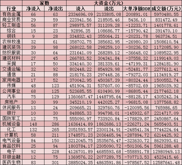 二、周五(7月2日)申萬(wàn)一級(jí)行業(yè)大單資金流向