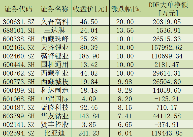 當(dāng)然,鹽湖提鋰板塊的行情也與資金面因素相關(guān)。今日,鹽湖提鋰板塊大單資金凈買入額為56.53億元,共有15只個股呈現(xiàn)大單資金凈買入狀態(tài),期間合計(jì)凈買入金額達(dá)到57.7億元。具體來看,天齊鋰業(yè)(157992.62萬元)、比亞迪(119443.85萬元)、贛鋒鋰業(yè)(110699.34萬元)3只個股獲大單資金凈買入額均超10億元;華友鈷業(yè)(44112.58萬元)、西藏礦業(yè)(29614.31萬元)、西藏珠峰(26515.33萬元)、西藏城投(26504.80萬元)、億緯鋰能(23569.89萬元)等個股獲大單資金凈買入額超2億元。