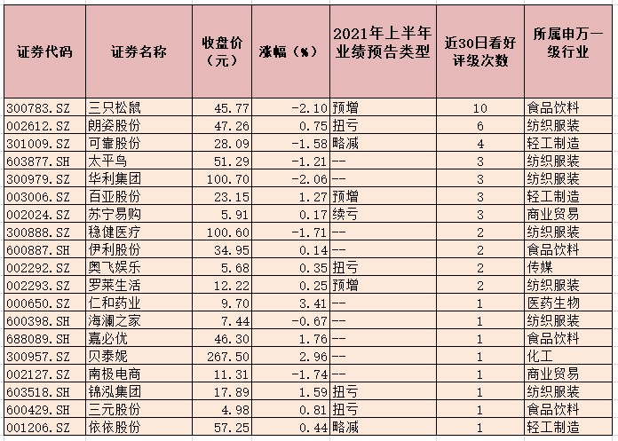 機(jī)構(gòu)對于三胎概念股也表示看好,最近30日內(nèi),有19只個股獲機(jī)構(gòu)給予“買入”或“增持”等看好評級,其中,三只松鼠、朗姿股份、可靠股份、太平鳥、華利集團(tuán)、百亞股份、蘇寧易購等7只個股獲得看好評級次數(shù)均在3次及以上。