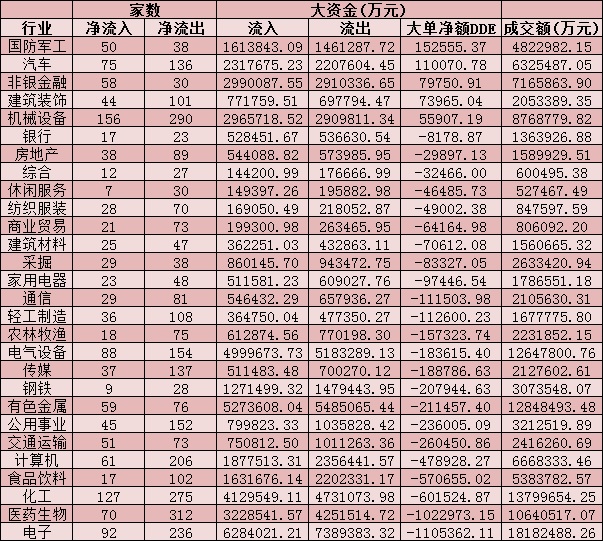 二、周五(7月23日)申萬一級行業(yè)大單資金流向