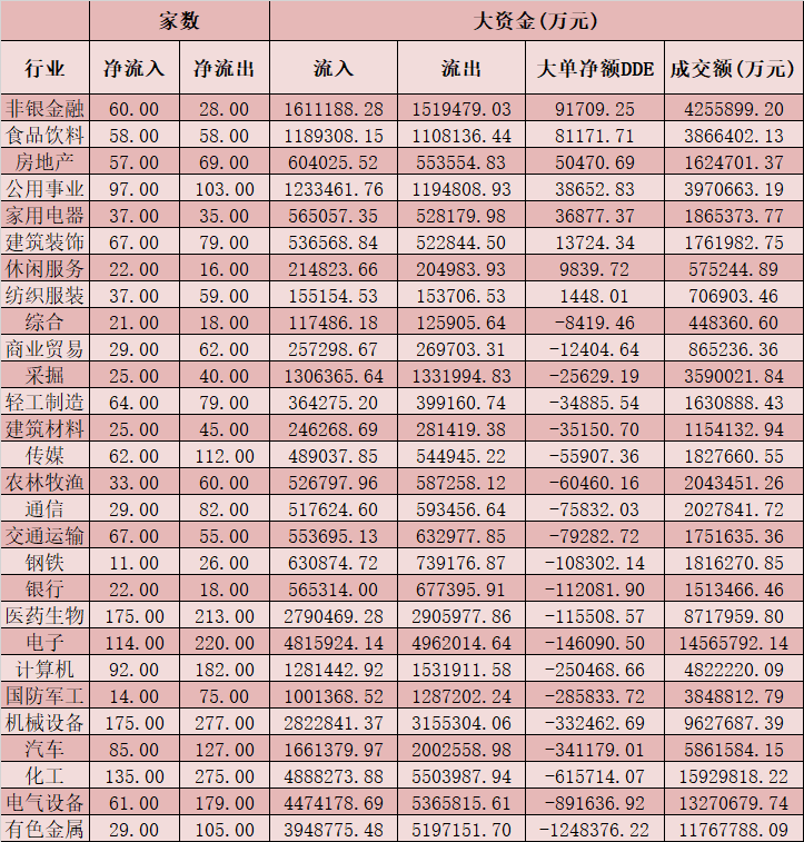 二、周一(8月16日)申萬一級行業(yè)大單資金流向