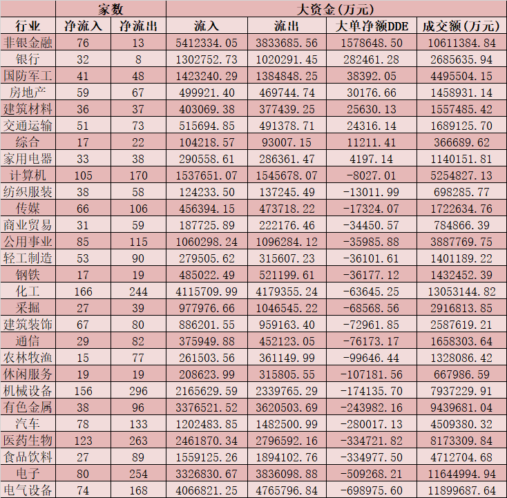 二、周三(8月18日)申萬(wàn)一級(jí)行業(yè)大單資金流向