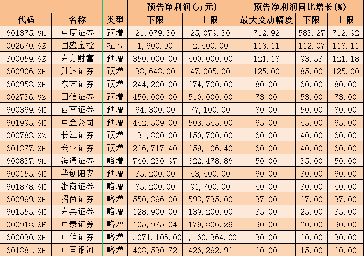 表:證券板塊18家業(yè)績預(yù)喜公司一覽