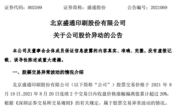 盛通股份連續(xù)6天漲停,8月23日,發(fā)布股價異動公告。