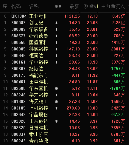 從盤面來看,工業(yè)母機概念板塊大漲,指數(shù)飆升12.13%,創(chuàng)世紀、華辰裝備、國盛智科、恒而達等7股獲20CM漲停。