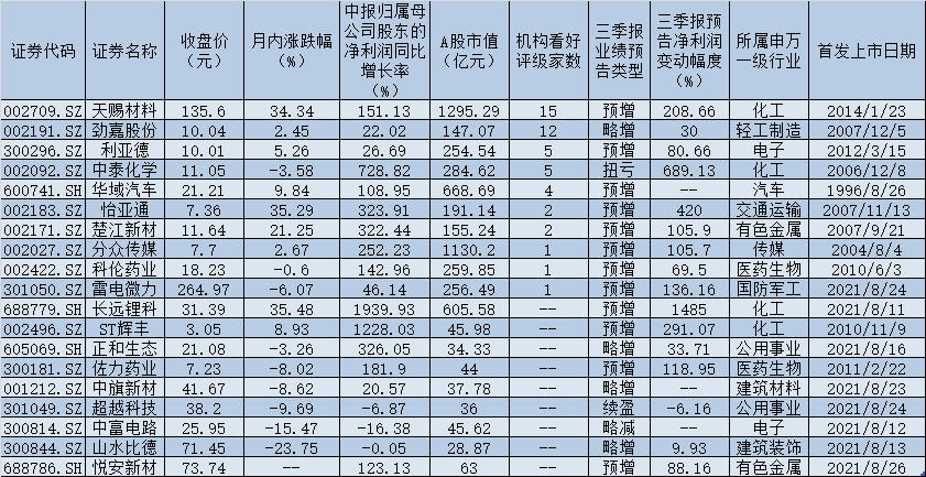 值得一提的是,上述業(yè)績(jī)預(yù)喜公司中,有10家公司最近1個(gè)月內(nèi)獲機(jī)構(gòu)給予“買(mǎi)入”或“增持”等看好評(píng)級(jí),其中,天賜材料、勁嘉股份等兩只個(gè)股機(jī)構(gòu)看好評(píng)級(jí)家數(shù)均在10家以上,分別為15家、12家,此外,利亞德、中泰化學(xué)、華域汽車(chē)、楚江新材、怡亞通等個(gè)股也均獲2家及以上機(jī)構(gòu)扎堆推薦。