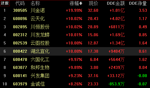 資金面,板塊呈DDE大單資金凈流入態(tài)勢,合計大單凈流入13.62億元,有24只個股凈流入,其中,云天化(4.02億元)、川發(fā)龍蟒(1.69億元)、洛陽鉬業(yè)(1.60億元)、云圖控股(1.34億元)、新洋豐(1.20億元)、川金諾(1.01億元)等6只個股DDE資金流入均超1億元,合計10.86億元。