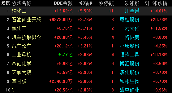 從熱點板塊來看,漲幅榜前10位的板塊顯示化工、原材料方面更受關注,工業(yè)母機也延續(xù)了周四的上漲。磷化工居首,近5日漲幅也達到14.61%,顯示強勢已持續(xù)一段時間,板塊DDE資金凈流入13.62億元,有包括川金諾、云天化和川恒股份在內的11只個股漲停。