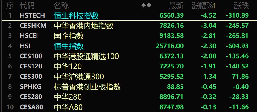 9月9日,港股市場(chǎng)在經(jīng)過(guò)前期的觸底震蕩回升后出現(xiàn)回調(diào),截至收盤,港股主要指數(shù)普遍收跌,其中,恒生指數(shù)跌2.3%,報(bào)25716點(diǎn),恒生科技指數(shù)回調(diào)較大,跌4.52%,報(bào)6560.39點(diǎn)。