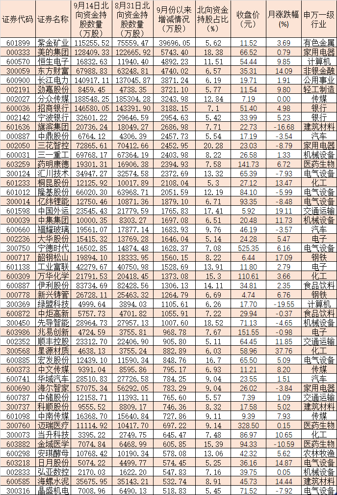 表:9月份以來北向資金增持?jǐn)?shù)量超1000萬(wàn)股且持股比例在5%以上的個(gè)股