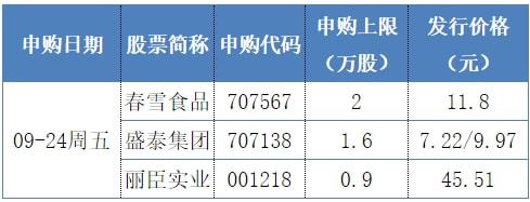 根據(jù)新股發(fā)行安排,9月24日(周五)將有主板3家企業(yè)開(kāi)啟申購(gòu),分別為湖南的麗臣實(shí)業(yè)(001218)、浙江的盛泰集團(tuán)(605138)和山東的春雪食品(605567)。其中,表面活性劑廠商麗臣實(shí)業(yè)具有“肉簽”潛質(zhì)。