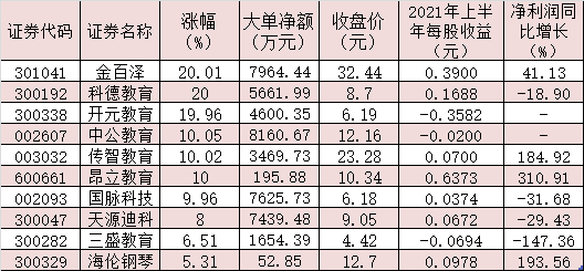 良好的市場(chǎng)表現(xiàn)離不開(kāi)資金的支持,10月13日,職業(yè)教育板塊內(nèi)共有31只概念股呈現(xiàn)大單資金凈流入態(tài)勢(shì),占比逾五成。中公教育大單資金凈流入居首,達(dá)到8160.67萬(wàn)元,金百澤、國(guó)脈科技、天源迪科、陜西金葉、科德教育等5只概念股當(dāng)日也均受到5000萬(wàn)元以上大單資金追捧,開(kāi)元教育、傳智教育、天舟文化、三盛教育、遼寧成大等5只概念股大單資金凈流入也均逾1000萬(wàn)元,這11只概念股合計(jì)吸金5.52億元。