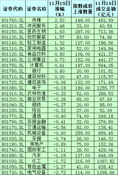 周一(11月15日)申萬一級行業(yè)市場表現(xiàn)情況: