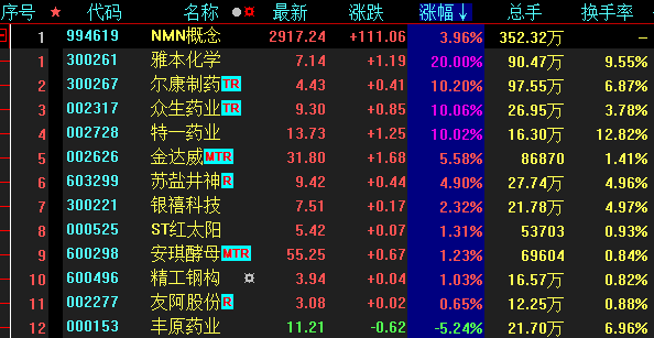 11月15日,長壽藥NMN概念發(fā)力,雅本化學、眾生藥業(yè)、特一藥業(yè)漲停,爾康制藥、金達威等個股漲幅也均在5%以上。