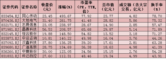 其六,同心傳動漲幅最大,截至收盤漲幅達493.67%,盤中一度漲超500%,牢牢占據(jù)新股漲幅榜首位。周一,10只北交所的新股開盤全線大漲,截至收盤,10只新股漲幅均超100%,平均漲幅達199.8%。
