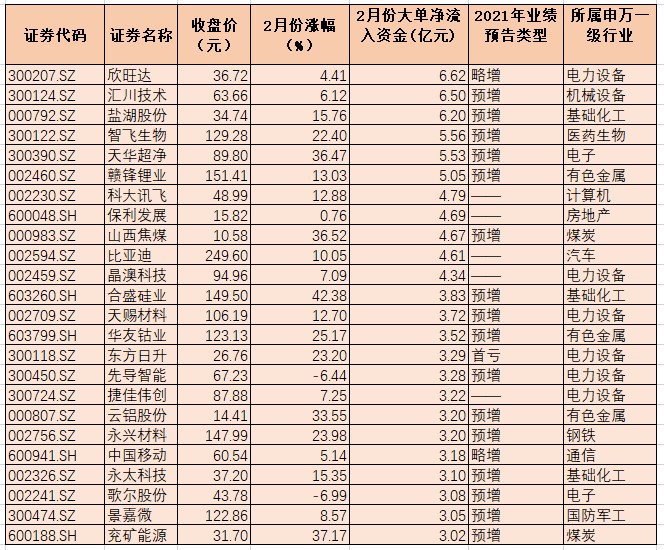 具體來看,東方財富Choice數(shù)據(jù)顯示,2月份,有860只個股期間呈現(xiàn)大單資金凈流入態(tài)勢,占A股總數(shù)為18.17%。其中,欣旺達、匯川技術(shù)、鹽湖股份等3只個股期間獲大單資金凈流入額居前,分別為6.62億元、6.50億元、6.20億元。智飛生物、天華超凈、贛鋒鋰業(yè)、科大訊飛、保利發(fā)展、山西焦煤、比亞迪、晶澳科技等8只個股期間大單資金凈流入均超4億元,上述11只個股期間合計大單資金凈流入為58.55億元。