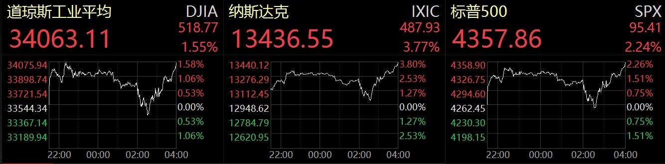 受此消息影響,美股全線走高,截至當(dāng)?shù)貢r(shí)間3月16日收盤,美股三大指數(shù)集體漲超1%,道瓊斯指數(shù)漲1.55%,報(bào)34063.1點(diǎn);標(biāo)普500指數(shù)漲2.24%,報(bào)4357.86點(diǎn);納斯達(dá)克指數(shù)漲3.77%,報(bào)13436.55點(diǎn),為2020年11月份以來最大單日漲幅。