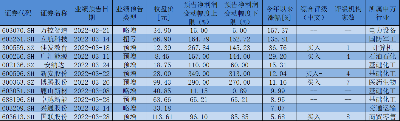 市場(chǎng)表現(xiàn)方面,今年以來(lái),截至3月28日收盤(pán),在上述71只業(yè)績(jī)預(yù)喜股中,共有35只個(gè)股期間累計(jì)漲幅跑贏上證指數(shù)(期間累計(jì)下跌11.68%),其中,萬(wàn)控智造、立航科技、佳發(fā)教育、廣匯能源、安納達(dá)、新安股份、博騰股份等7只個(gè)股期間累計(jì)漲幅超10%,十分強(qiáng)勢(shì)。