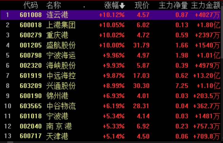 港口航運(yùn)板塊表現(xiàn)強(qiáng)勢(shì),包括連云港、上港集團(tuán)、重慶港等在內(nèi)的6只個(gè)股集體漲停。