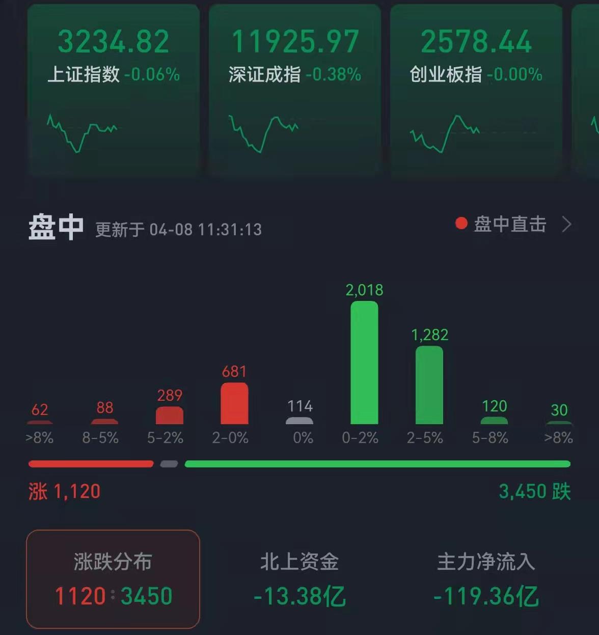 4月8日,A股三大指數(shù)呈震蕩整理態(tài)勢(shì)。截至上午收盤,上證指數(shù)微跌0.06%,報(bào)3234.82點(diǎn);深證成指和創(chuàng)業(yè)板指跌幅分別為0.38%和0.09%;滬深兩市合計(jì)成交額5855.1億元;總體來看,兩市個(gè)股跌多漲少,上漲家數(shù)達(dá)1120家。