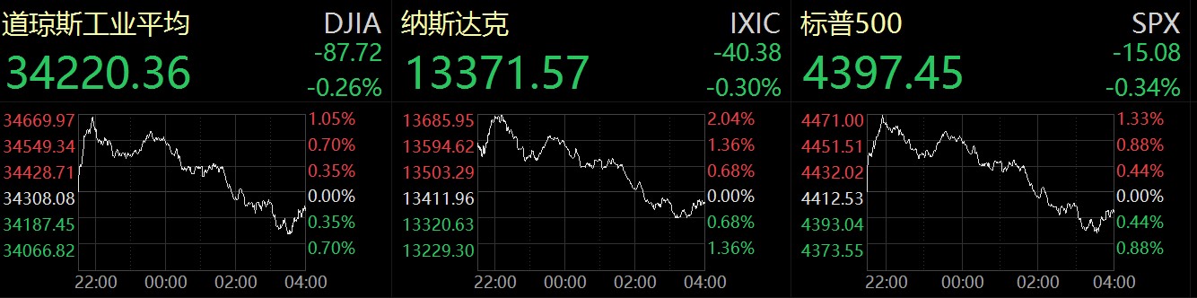 市場(chǎng)表現(xiàn)方面,當(dāng)?shù)貢r(shí)間4月12日,美股三大指數(shù)高開低走,道指和標(biāo)普500指數(shù)盤中一度漲逾1%,納指最高漲超2%,不過(guò),三大指數(shù)集體收跌,截至收盤,道瓊斯指數(shù)跌0.26%,報(bào)34220.36點(diǎn);標(biāo)普500指數(shù)跌0.34%,報(bào)4397.45點(diǎn);納斯達(dá)克指數(shù)跌0.3%,報(bào)13371.57點(diǎn)。
