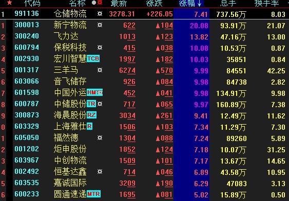 具體來(lái)看, 4月13日11:30,倉(cāng)儲(chǔ)物流板塊再度爆發(fā)。截至上午收盤(pán),板塊漲幅居首達(dá)7.41%。7只概念股集體漲停,新寧物流“20cm”漲停。值得注意的是,新寧物流、保稅科技等連續(xù)3個(gè)交易日漲停。