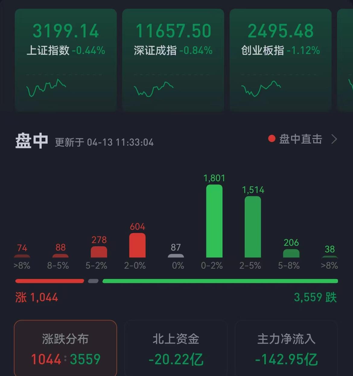 4月13日,A股三大指數(shù)震蕩回落。截至11:30,上證指數(shù)跌幅達(dá)0.44%,報(bào)3199.14點(diǎn);深證成指和創(chuàng)業(yè)板指跌幅分別為0.84%和1.12%;滬深兩市合計(jì)成交額5376.3億元;總體來(lái)看,兩市個(gè)股跌多漲少。