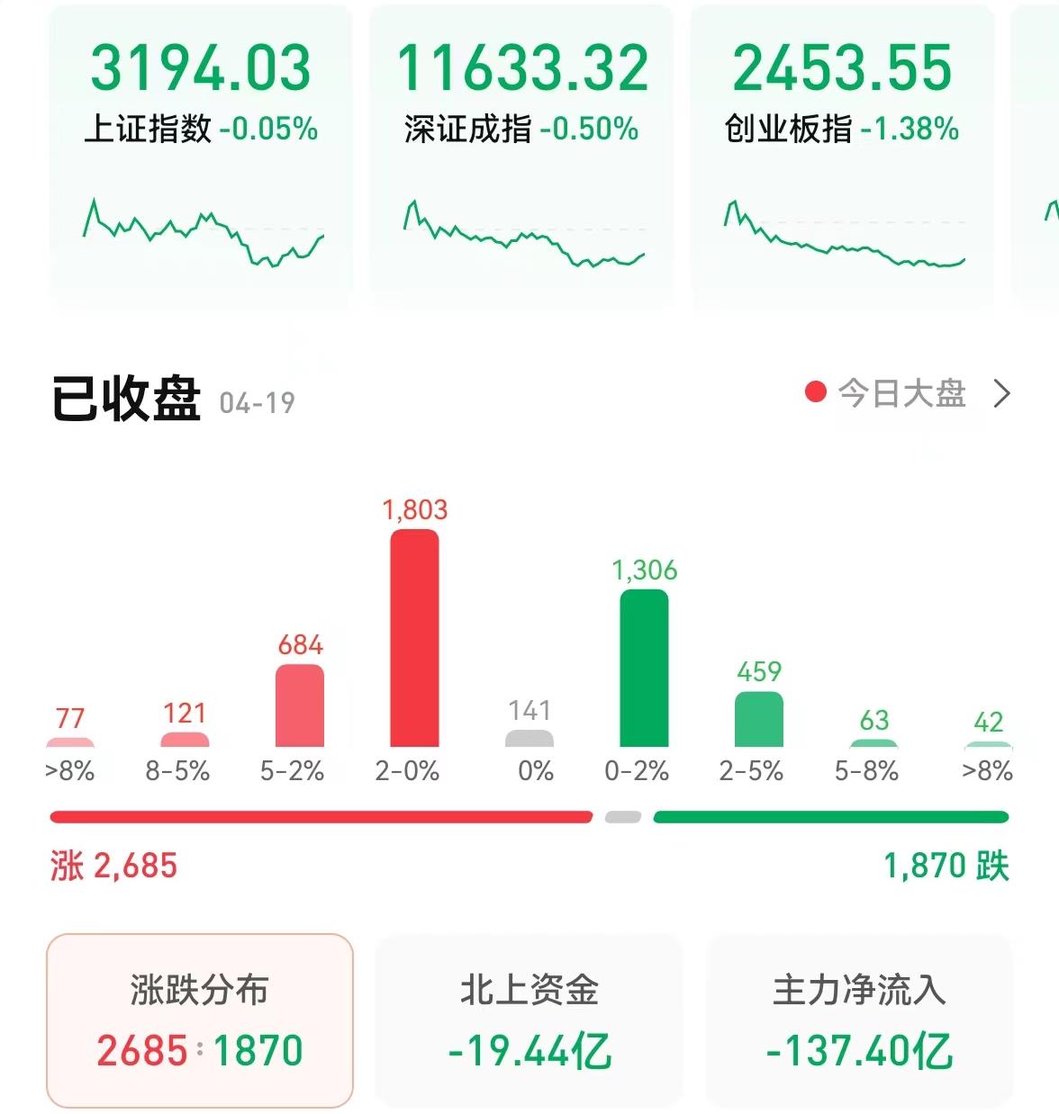 截至收盤,上證指數(shù)跌0.05%報3194.03點,深證成指跌0.5%報11633.32點,創(chuàng)業(yè)板指跌1.38%報2453.55點;兩市合計成交7793.9億元,北向資金凈賣出19.44億元。