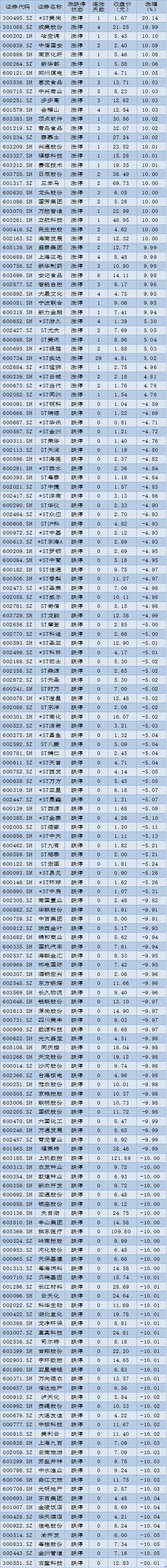 周四(4月21日)漲跌停個(gè)股情況: