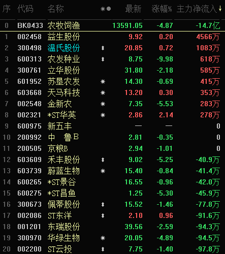 冰點(diǎn):農(nóng)牧飼漁行業(yè)下跌4.87%