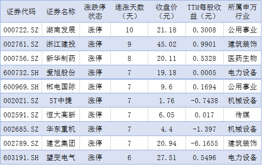 表:連續(xù)上漲且今日收盤漲停股前10位