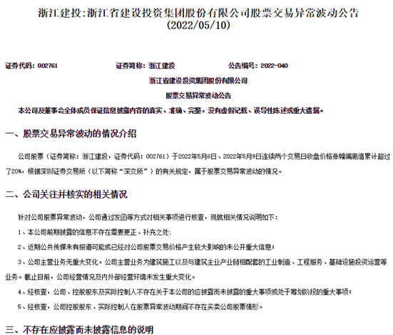 對(duì)于股價(jià)的異常波動(dòng),浙江建投今日發(fā)布公告:“公司目前沒有任何根據(jù)《深圳證券交易所股票上市規(guī)則》規(guī)定應(yīng)予以披露而未披露的事項(xiàng)或與該事項(xiàng)有關(guān)的籌劃、商談、意向、協(xié)議等;董事會(huì)也未獲悉本公司有根據(jù)《深圳證券交易所股票上市規(guī)則》的規(guī)定應(yīng)予以披露而未披露的、對(duì)本公司股票及其衍生品種交易價(jià)格產(chǎn)生較大影響的信息;公司前期披露的信息不存在需要更正、補(bǔ)充之處。”