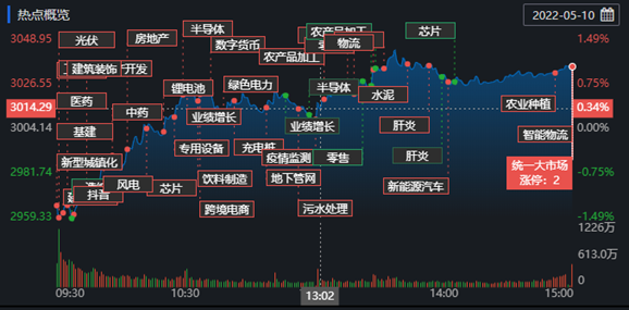 5月10日,受隔夜美股大跌影響,A股三大指數(shù)早盤低開,隨后快速翻紅。截至收盤,上證指數(shù)漲1.06%,報(bào)3035.85點(diǎn),深證成指漲1.37%,報(bào)10912.74點(diǎn),創(chuàng)業(yè)板指漲2.17%,報(bào)2276.35點(diǎn);滬深兩市合計(jì)成交額8468.6億元;總體來看,兩市個(gè)股漲多跌少,上漲股達(dá)3707只。