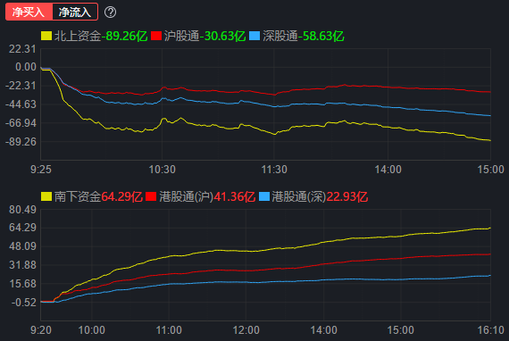北向資金今日盤中呈單邊大幅流出態(tài)勢(shì),全天凈賣出89.26億元,其中,滬股通凈賣出30.63億元,深股通凈賣出58.63億元。